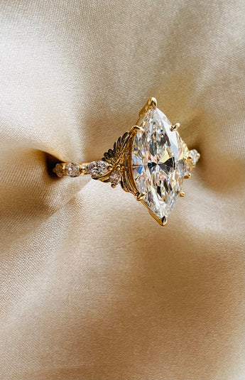 Gorgeous fantasy inspired Butterfly engagement ring, features a stunning sparkling marquise cut lab diamond, surrounded by delicate carved gold gold butterfly motives, embedded with small accented diamonds. This unique ring would fit a fairytale princess