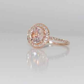 Halo engagement ring with round ice peach sapphire.