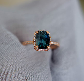 Halo engagement ring with cushion teal sapphire.
