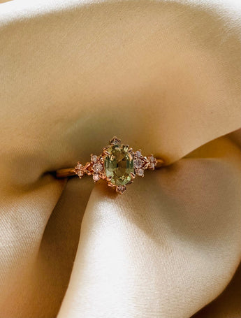 Stunning fairytale inspired engagement ring, features a delicate jasmine green oval center, surrounded by delicate carved gold gold floral motives, embedded with small clear diamonds or moissanites. This unique ring would fit a LOTR fantasy lover bride