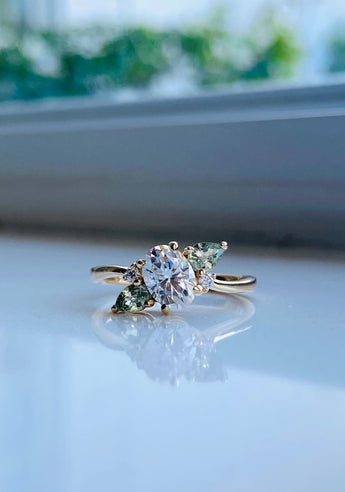 This unique ring from our latest collection, Angels of Light, features moissanites,natural vibrant mint green sapphires and diamonds, extremely sparkling vibrant ring.
