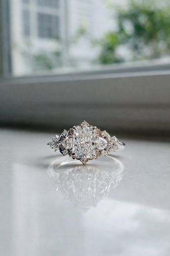 At its center sits a luminous 1ct radiant-cut lab-grown diamond, framed by sculpted floral motifs and butterfly-inspired details that give the ring a soft, almost ethereal presence.