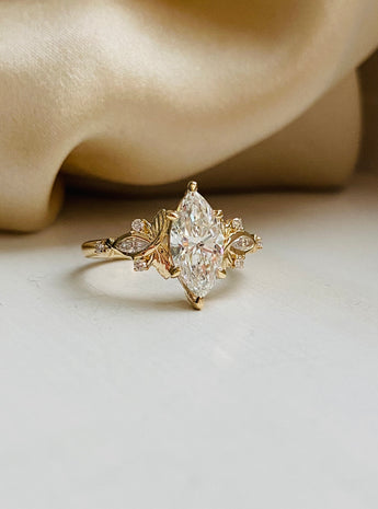 Gorgeous fantasy inspired Butterfly engagement ring, features a stunning sparkling marquise cut lab diamond, surrounded by delicate carved gold gold butterfly motives, embedded with small accented diamonds. This unique ring would fit a fairytale princess