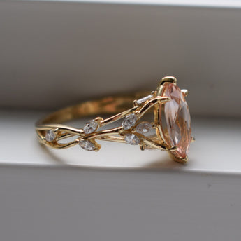 Inspired by vine ivy, this ring was created using gorgeous golden peach champagne natural sapphire, 1ct (5x10mm), marquise cut, and natural white diamonds. 12 diamonds in total, SI/H, TDW 0.4ct.