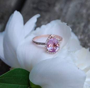 Halo engagement ring with pear rosé sapphire.