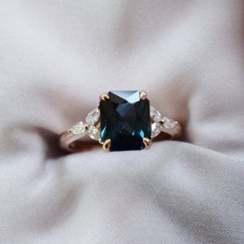 Trillium engagement ring with radiant cut peacock sapphire.
