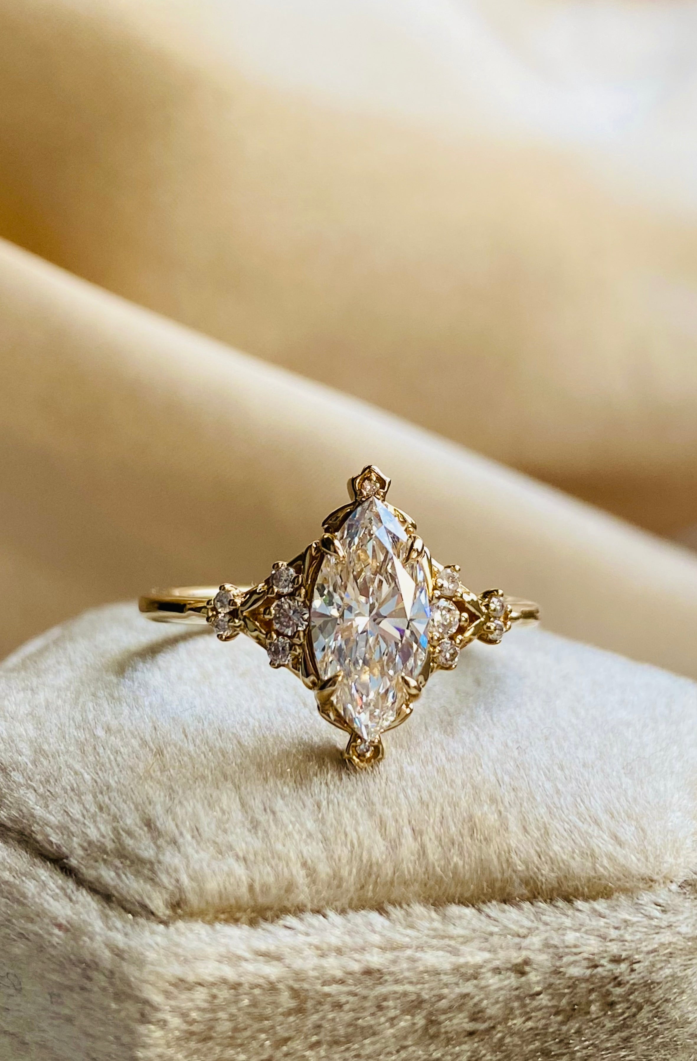 At its center rests a marquise-cut lab grown diamond, elongated and light-catching, framed by delicate leaf-like details that flow organically along the band. The setting feels almost grown rather than made, echoing elvish craftsmanship and old-world fantasy.