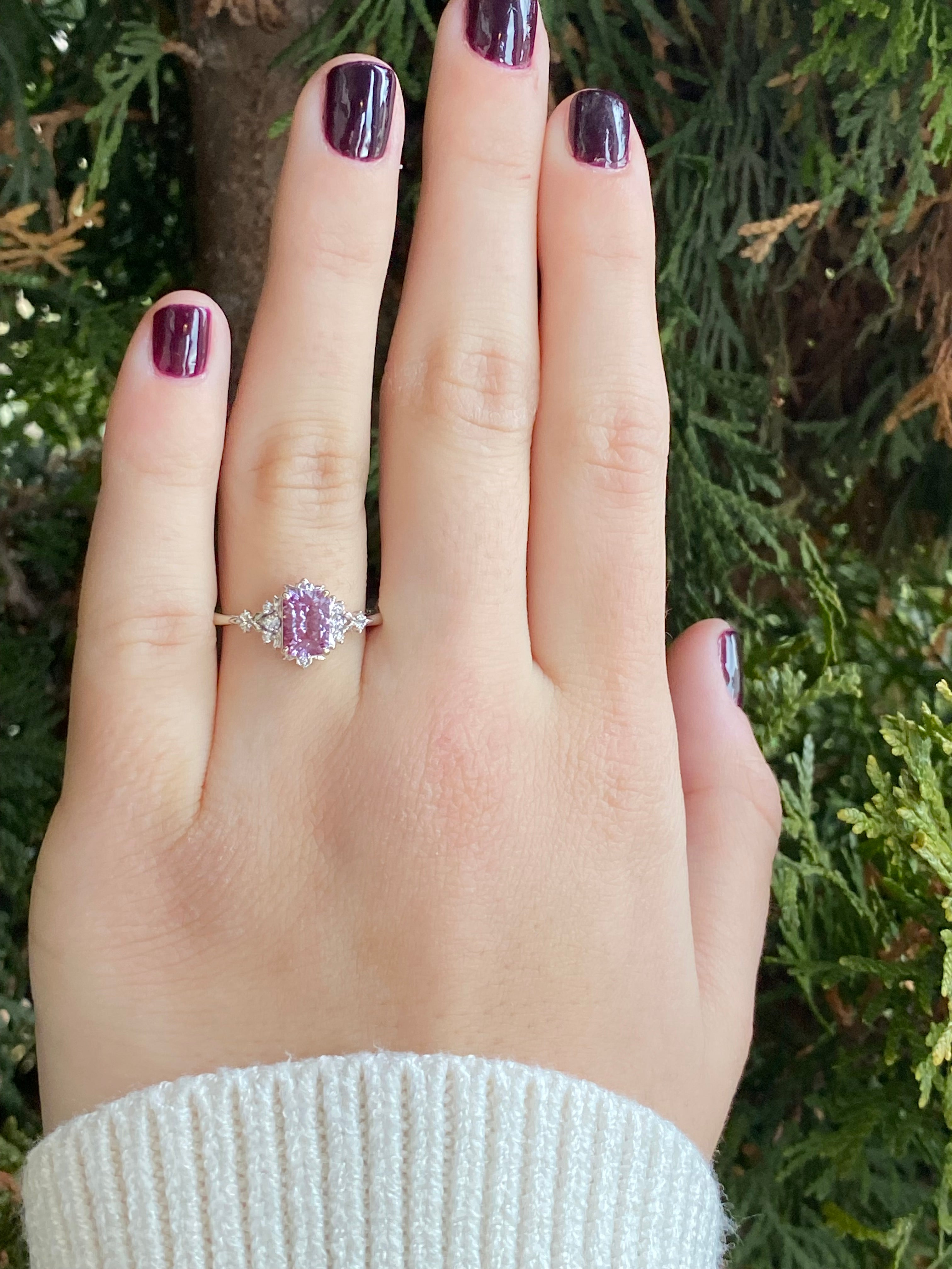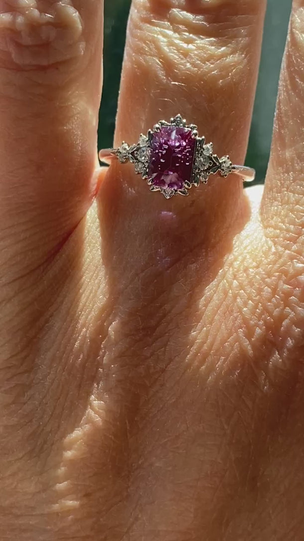Set in polished white gold, the center stone displays alexandrite’s signature color-shift tones — revealing plum, berry, and soft violet hues depending on the light. The elongated rectangular cut enhances depth and movement, giving the stone an almost magical glow.