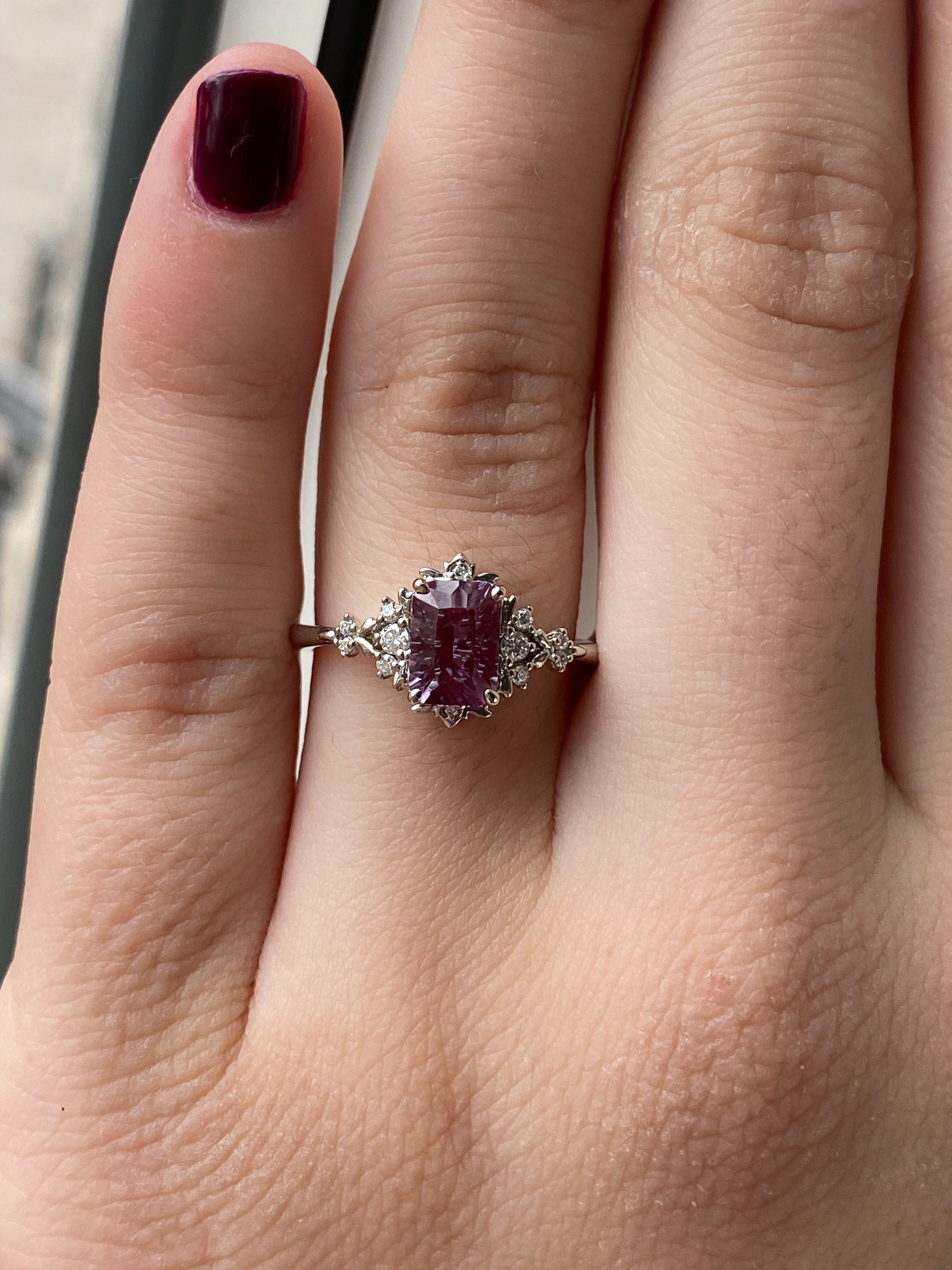 The Dela ring is a luminous fantasy engagement ring centered around a rare-feeling rectangular lab-grown alexandrite, cut in a bespoke multifaceted fantasy style that ignites light from every angle.