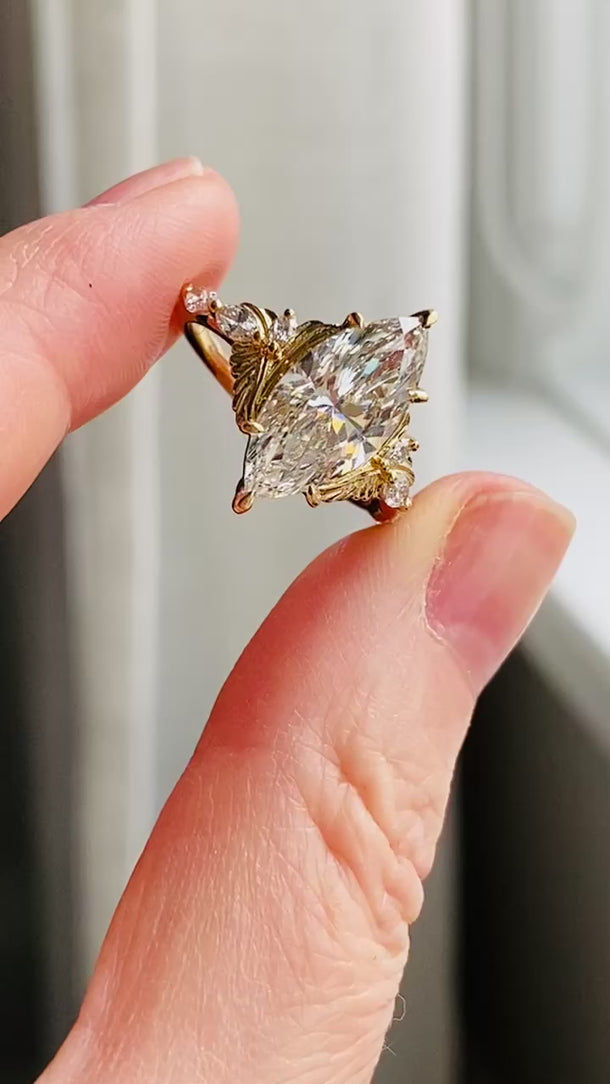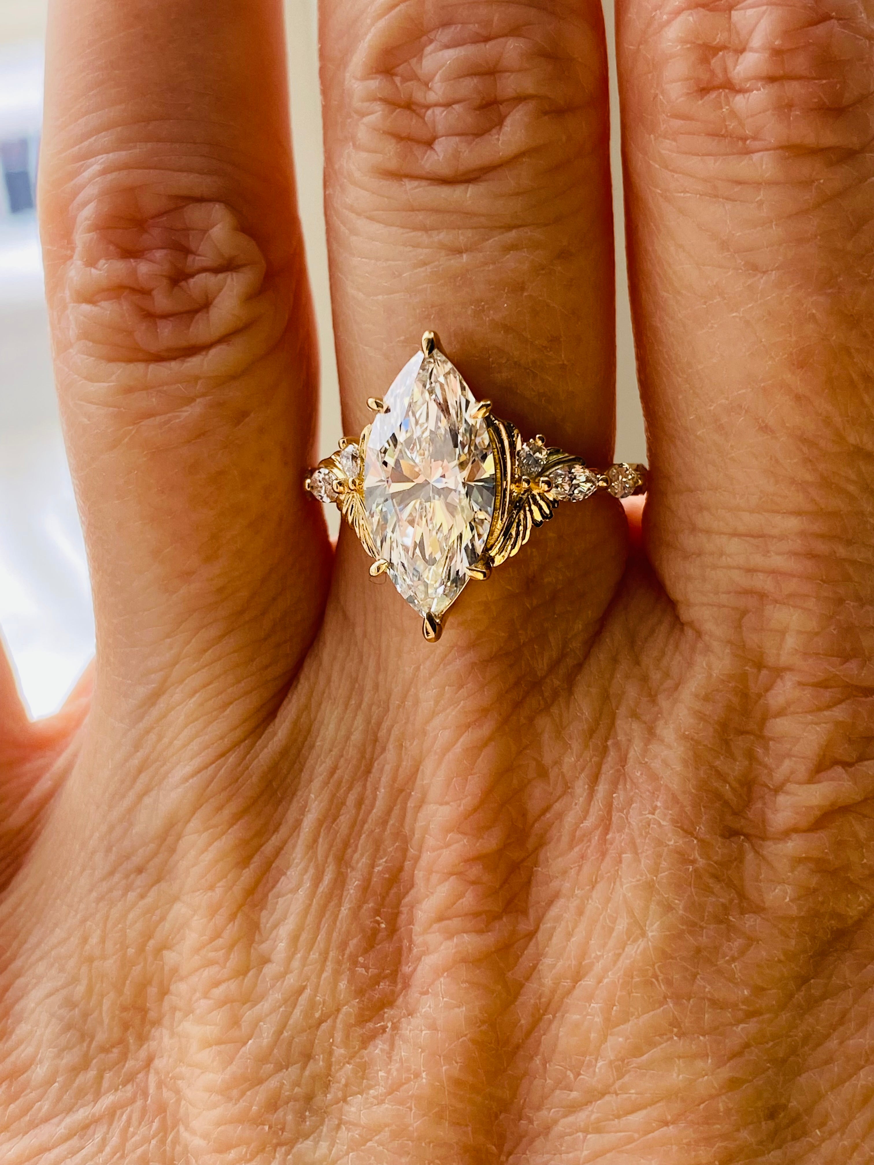 Gorgeous fantasy inspired Butterfly engagement ring, features a stunning sparkling marquise cut lab diamond, surrounded by delicate carved gold gold butterfly motives, embedded with small accented diamonds. This unique ring would fit a fairytale princess