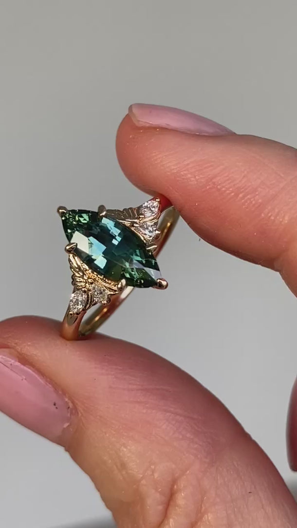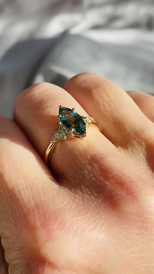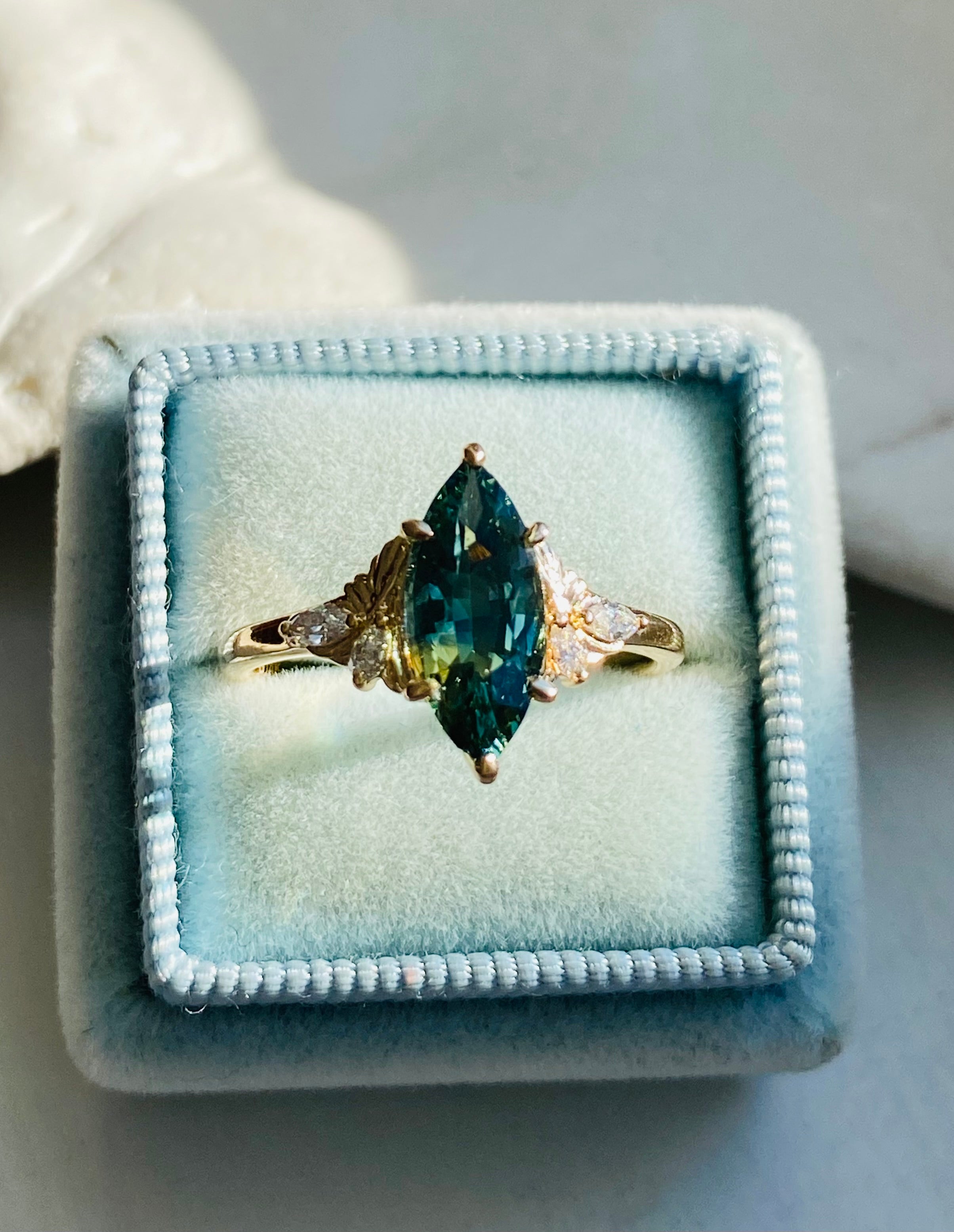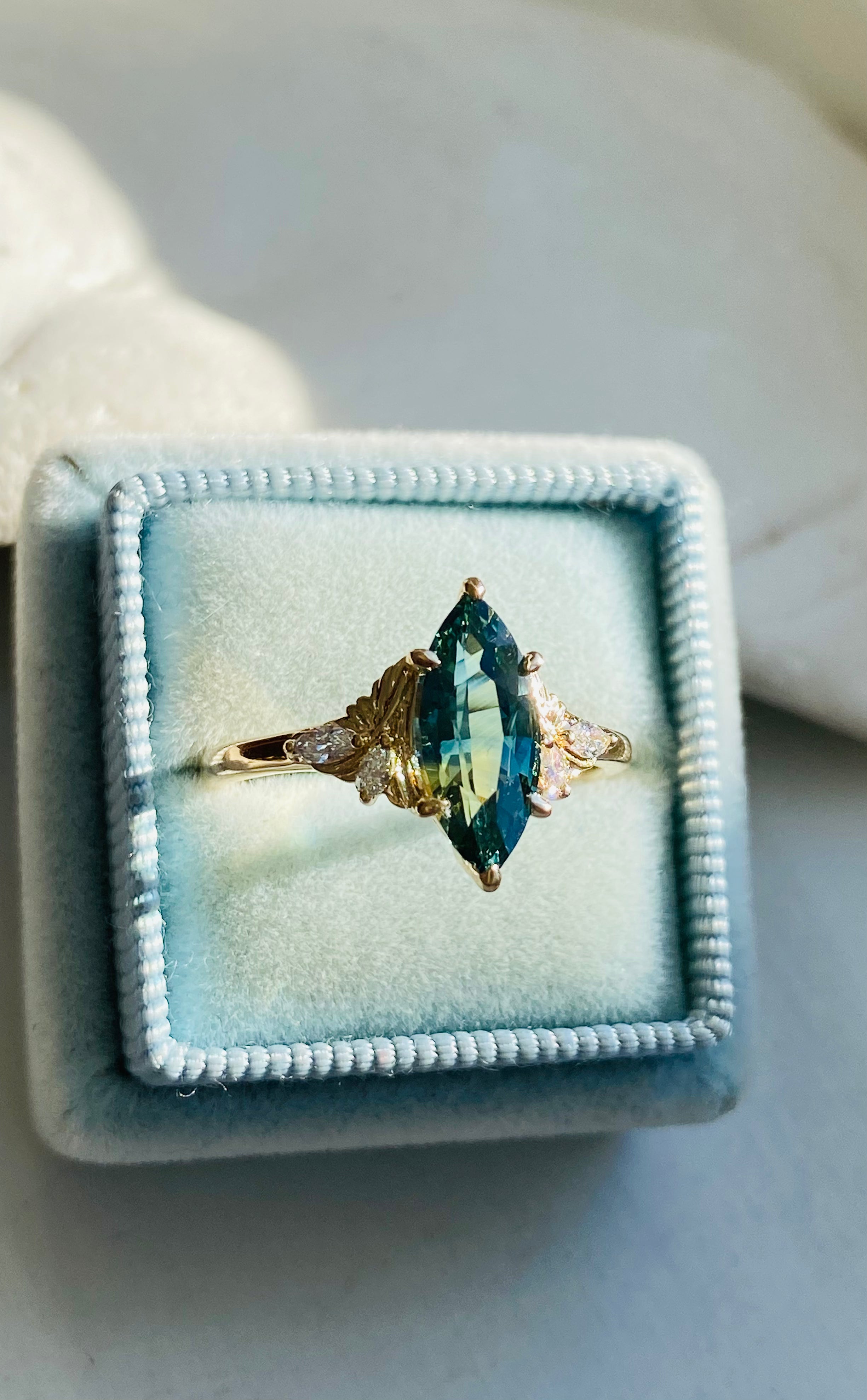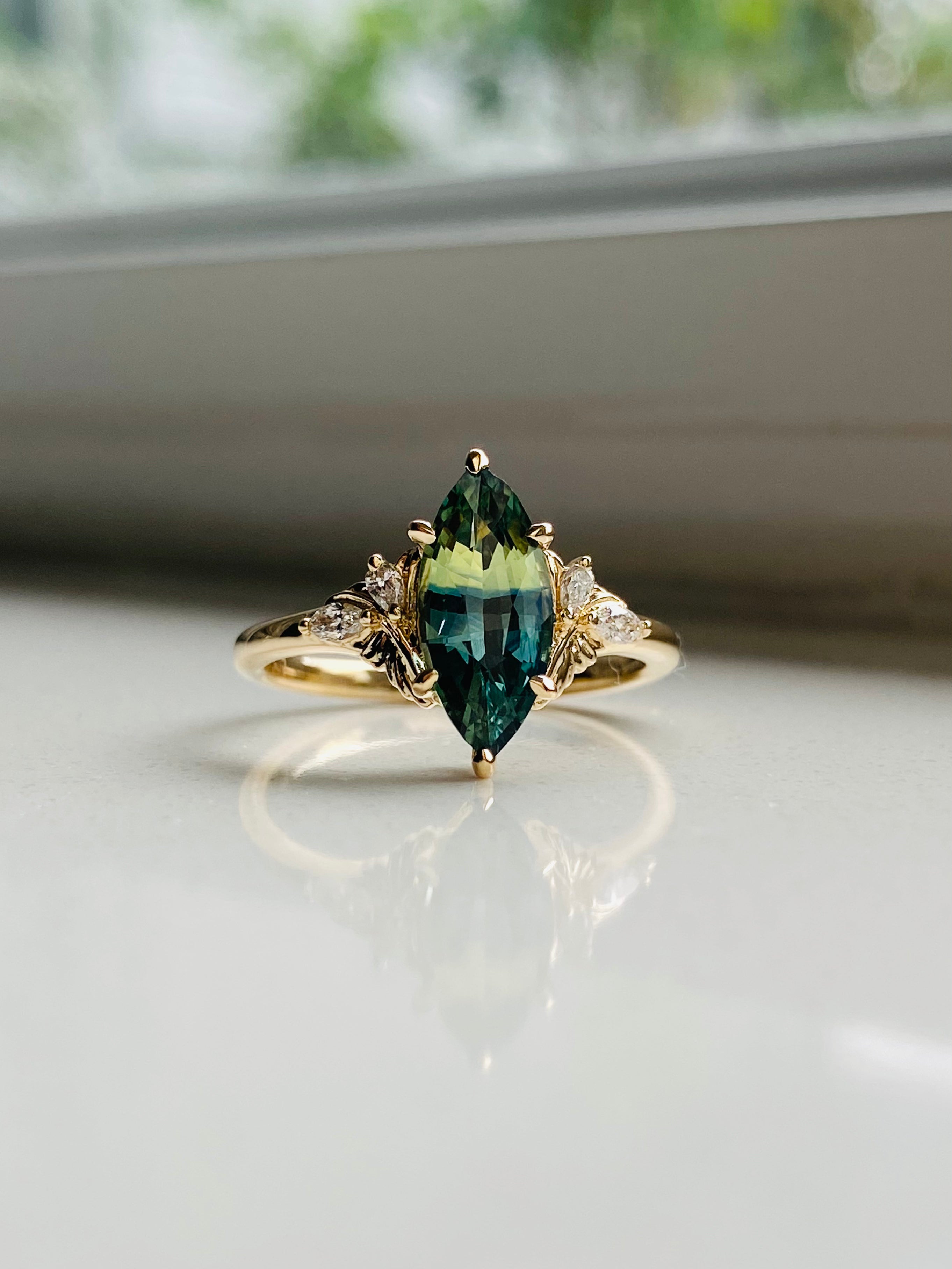 At its heart: a 1.5ct natural marquise-cut parti sapphire, alive with shifting tones of teal, deep blue, and mossy green — no two facets ever reflecting the same shade. This rare sapphire feels pulled from a forest clearing at dawn, where light filters through leaves and everything feels possible.