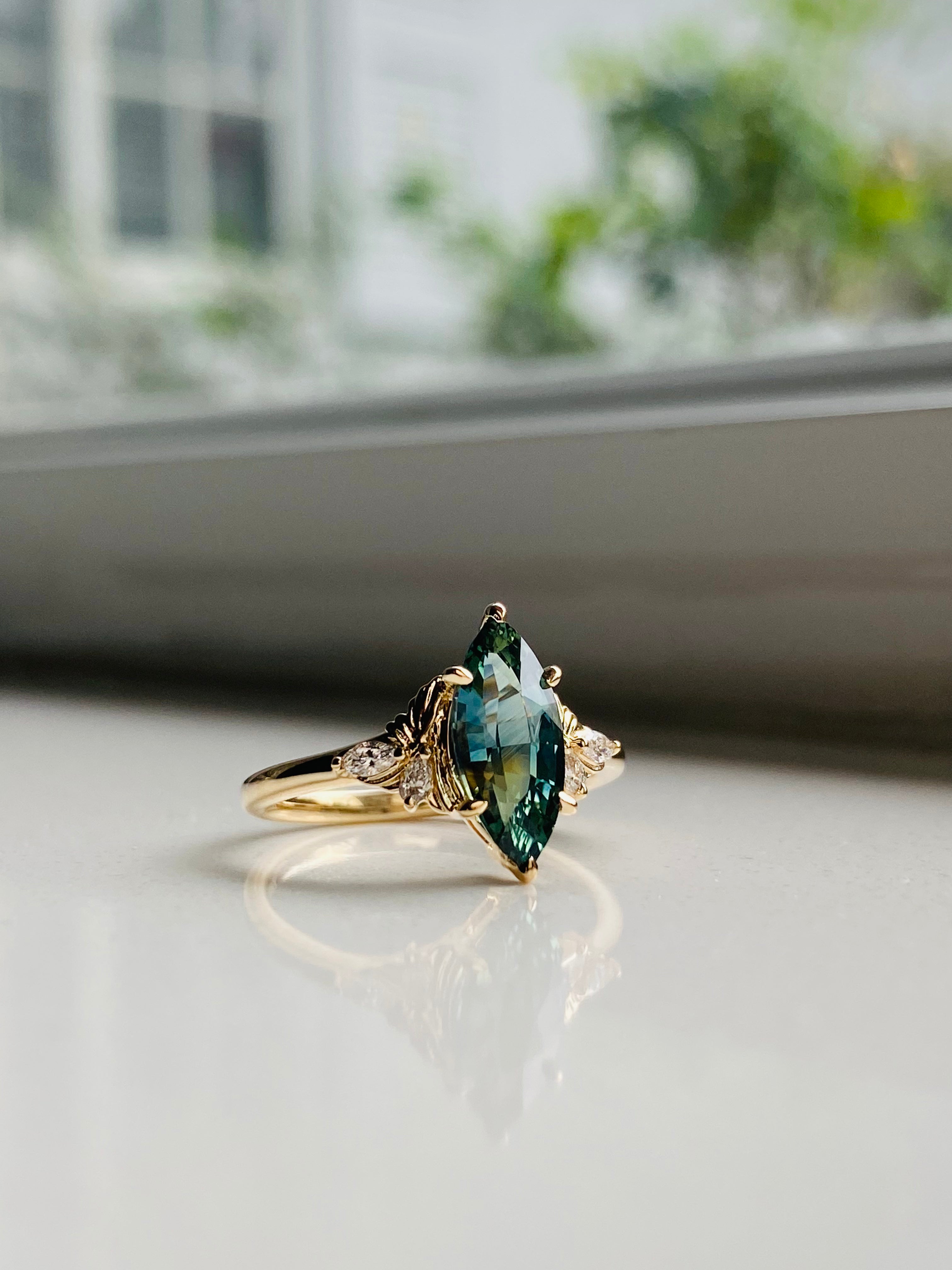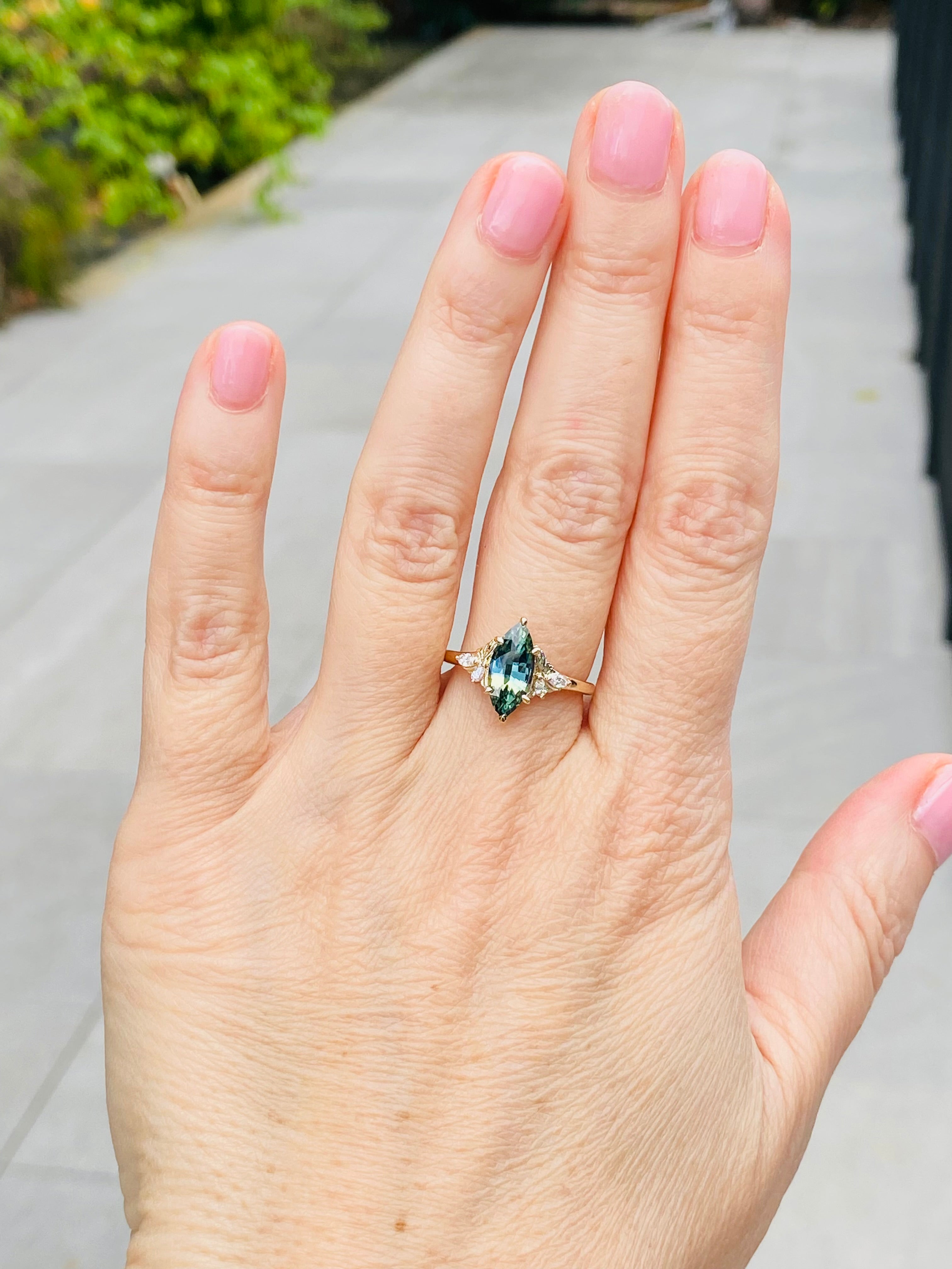 There is only one natural 1.5ct parti teal blue-green marquise sapphire like this in the world. Once sold, this exact ring cannot be recreated.