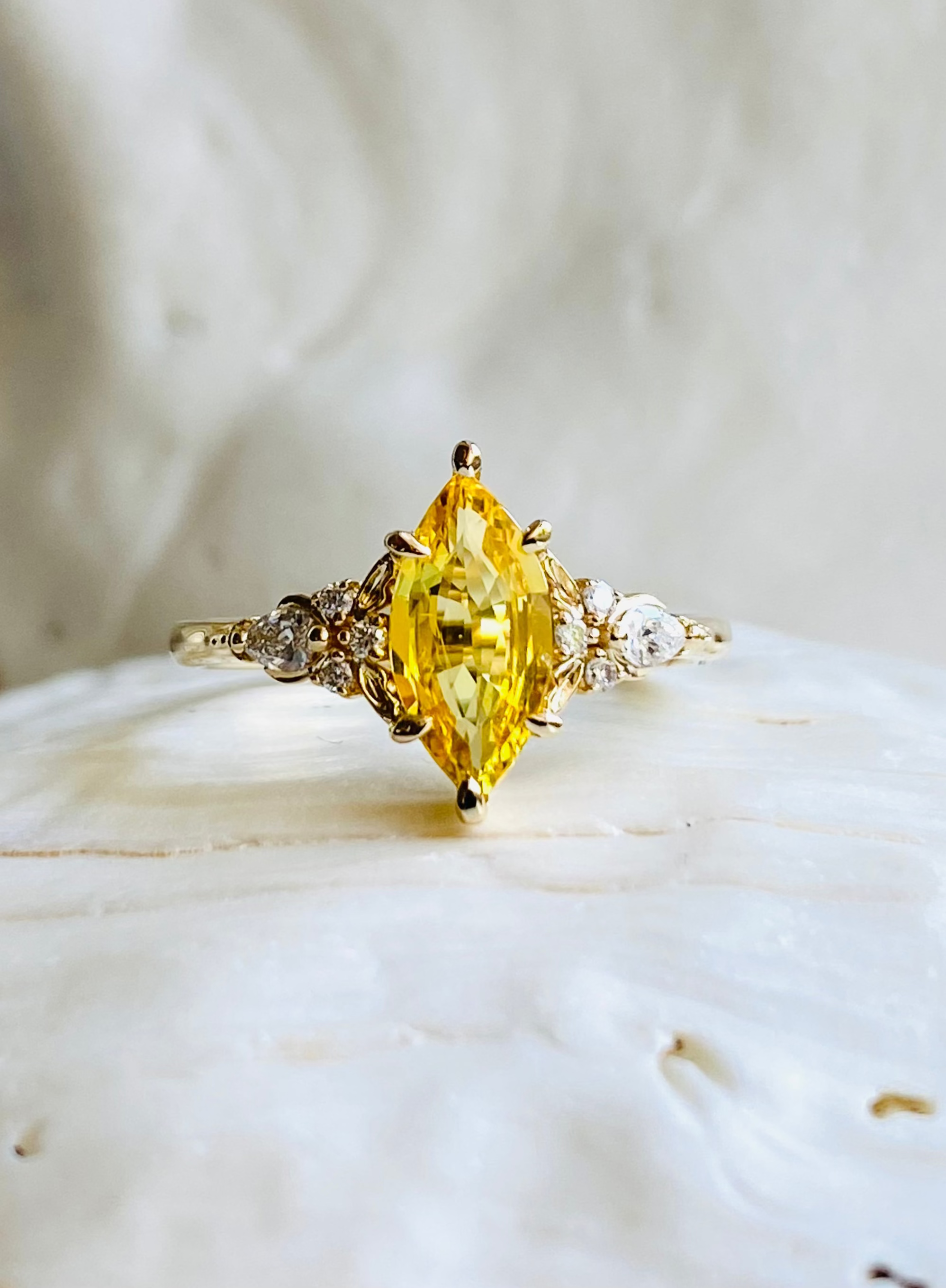 The Miele ring draws its inspiration from the delicate geometry of the bee — graceful, structured, purposeful. At its center glows a marquise-cut natural lemon yellow sapphire (10x5mm, approximately 1ct), elongated and luminous, catching the light like golden nectar.